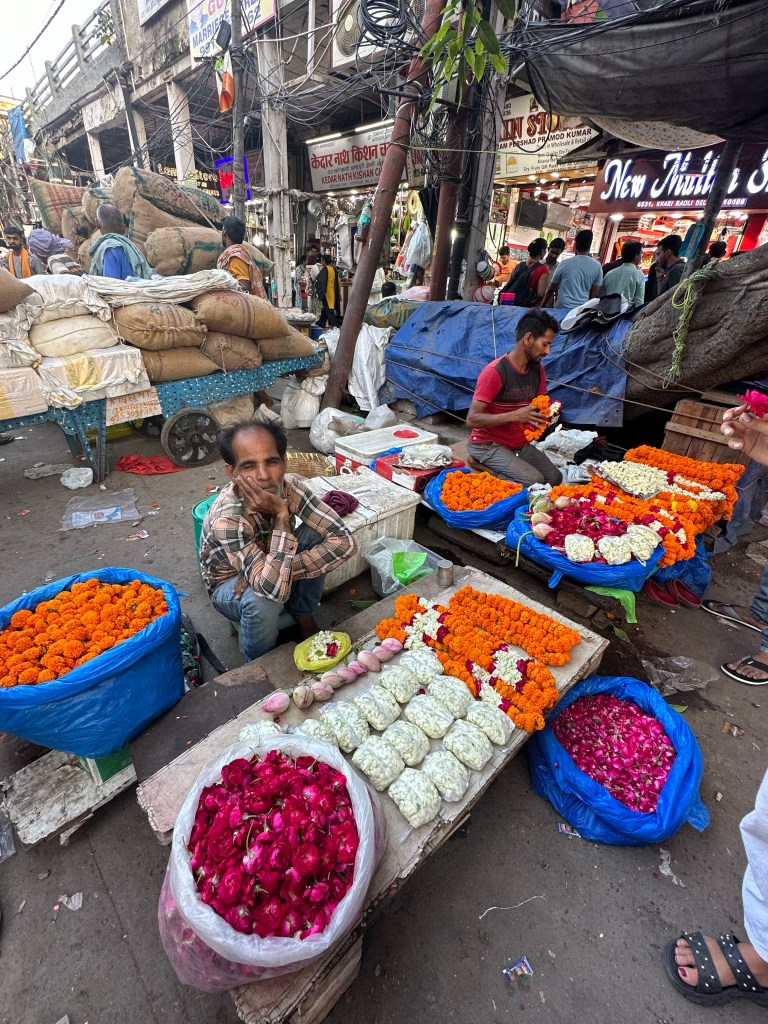 But also. Moments of beauty. A man selling flowers and marigold necklaces chains (the “official” flower of India) insisted on giving me a dusty dessert rose. I carried it and sniffed it as I walked through some of the most disgusting smelling market stalls I’ve ever smelled. Perhaps he knew I was going to need something sweet to smell in those moments. But after the repugnant smells wafted away, I’d occasionally catch a whiff of some spices….teas…nuts…or dates. And those sweet and nutty and aromatic smells are even more of a delight when you’re in India. With the cows, the garbage, the noise….the honking….the stench. It’s the land of contrasts.